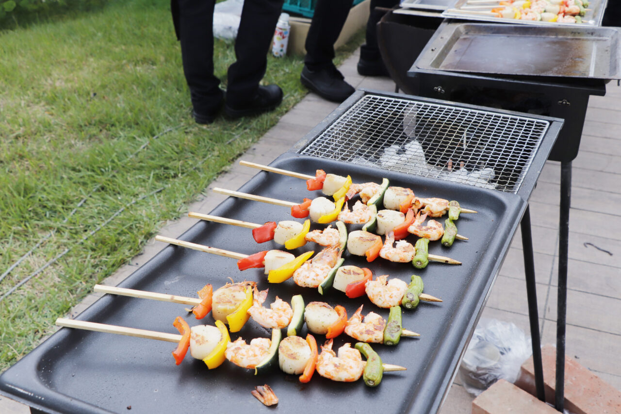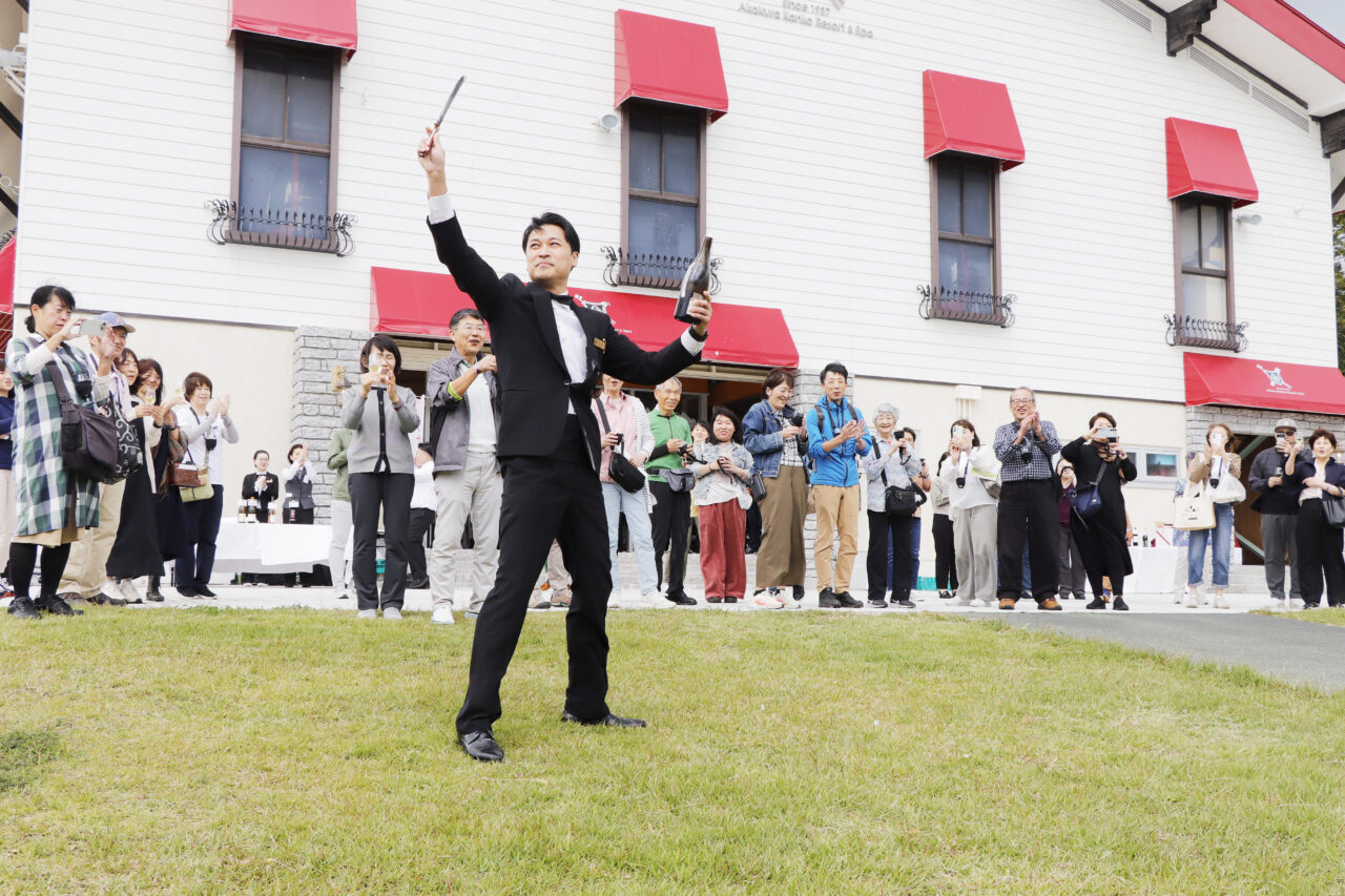 長めの刀(サーベル)でシュッとコルク部分を鮮やかに切り落とす、なんとも華々しい演出の「シャンパンサベラージュ」を皮切りに、ホテル料理長による特製オードブルBOXや、炭火焼きの串料理、ローストビーフ、スイーツや自家製パンなど、多彩なメニューがチケット制で提供されました。また、ホテルバーテンダーによるパンチカクテルの実演や、人気バンド「エバーグリーン」によるジャズライブがイベントを盛り上げました。