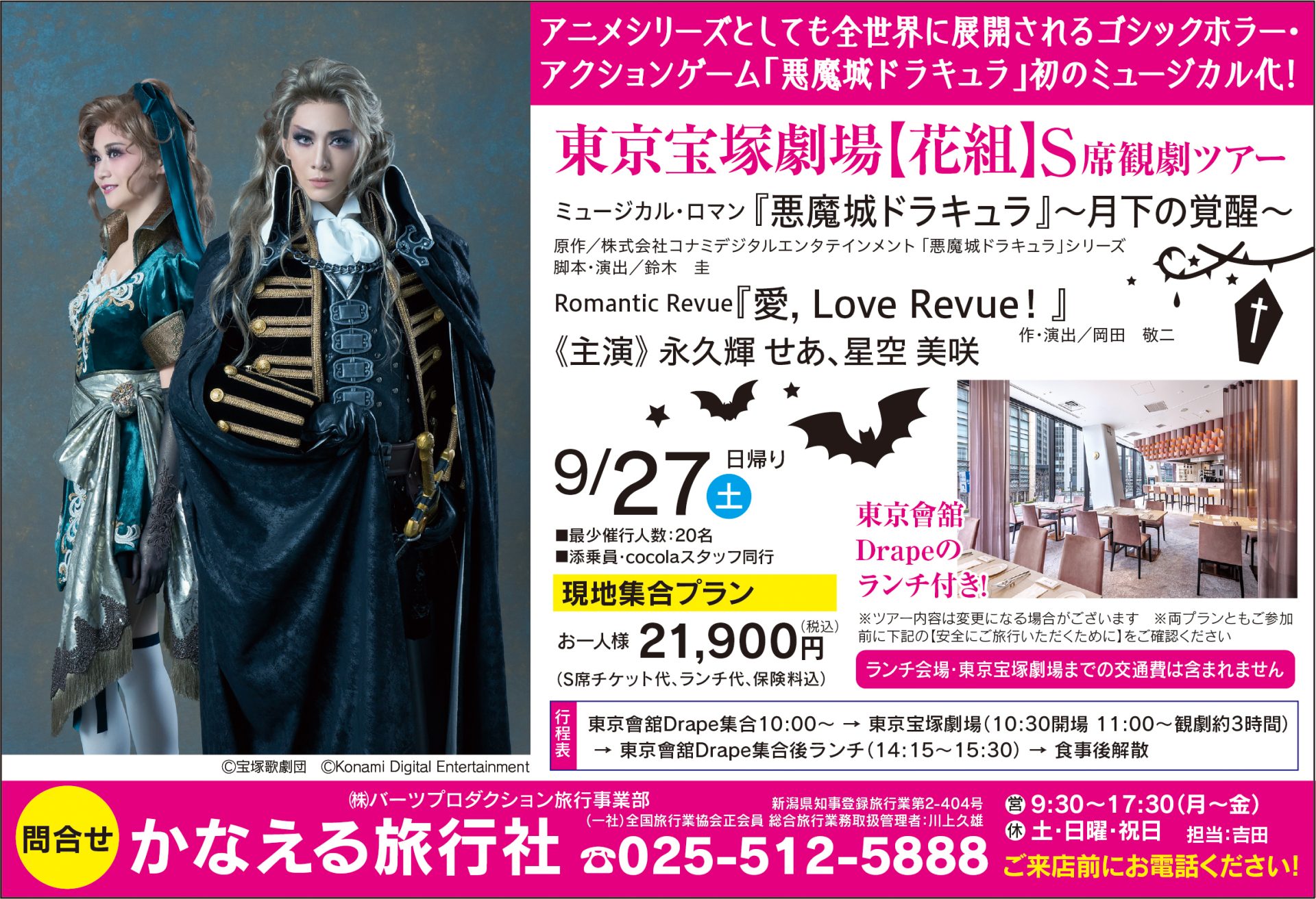 東京會舘Drape集合10:00~ → 東京宝塚劇場(10:30開場 11:00~観劇約3時間)→ 東京會舘Drape集合後ランチ(14:15~15:30)→ 食事後解散