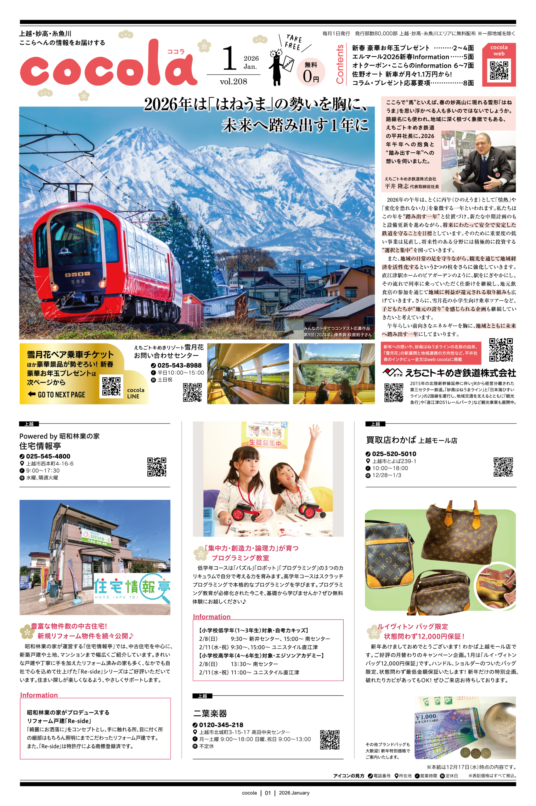 ![]() | 2025年7月号 夏のグルメとスイーツ・Information ここら日和~本町5丁目周辺編 阿部建設イベント&プレゼント企画 移住者に聞く上越の魅力・Debut!合同説明会 オトクーポン・求人情報 コラム・プレゼント |