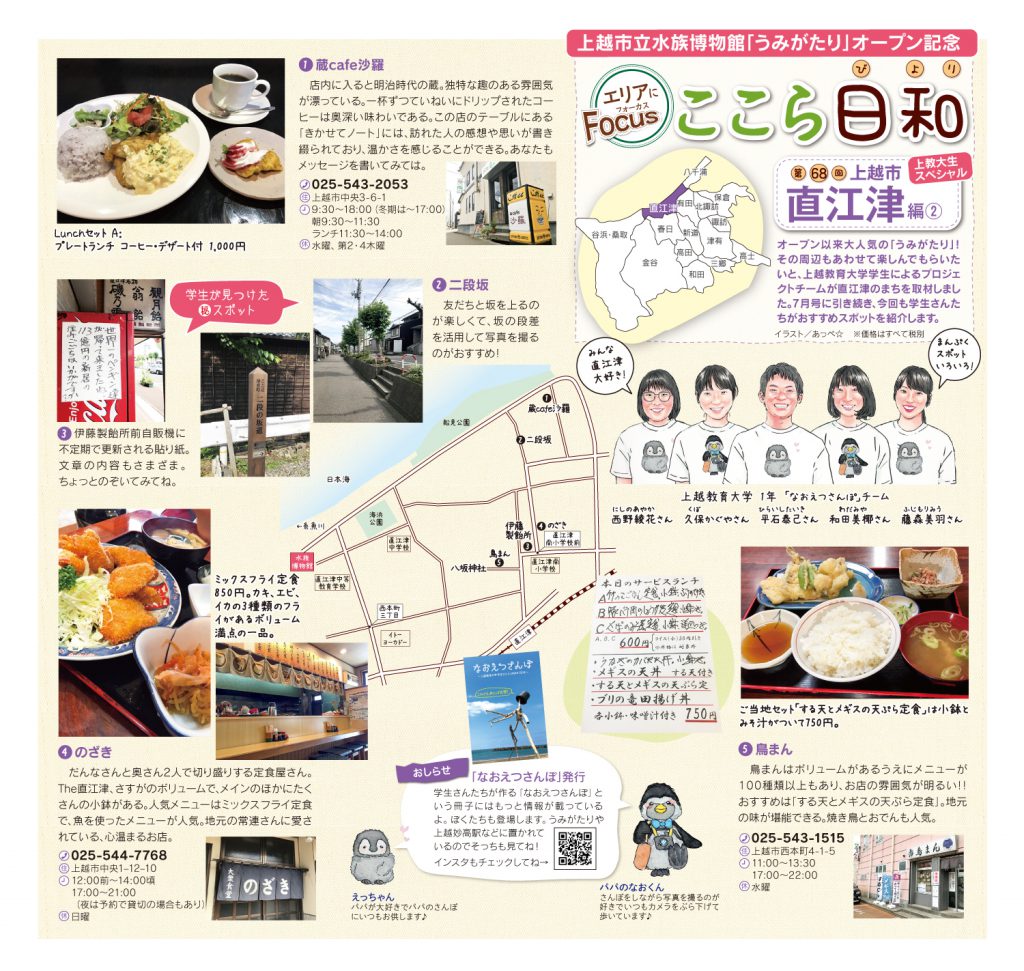 オープン以来大人気の「うみがたり」! その周辺もあわせて楽しんでもらいたいと、上越教育大学学生によるプロジェクトチームが直江津のまちを取材しました。7月号に引き続き、今回も学生さんたちがおすすめスポットを紹介します。