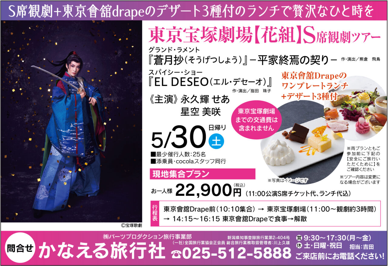 東京會舘Drape前(10:10集合) → 東京宝塚劇場(11:00~観劇約3時間)→ 14:15~16:15 東京會舘Drapeで食事→解散