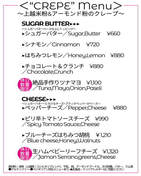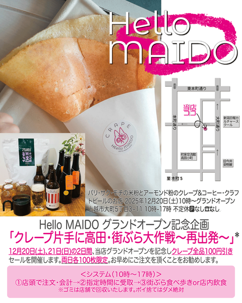 Hello MAIDO New Open 2025.12.182025/12/20 GRAND OPEN生地を楽しむクレープ屋が上越市大町の路地裏に誕生。看板メニューのシュガーバターは、上越産米粉とアーモンドプードルを使った特製生地を香ばしく焼き上げた一枚。パリッ・サクッ・モチッの食感がやみつきに。イートイン利用や雁木通りの食べ歩きにもおすすめ。住:上越市大町5-3-11営:10:00~17:00休:不定休P :近くの公共駐車場を利用Instagram▼ Instagram